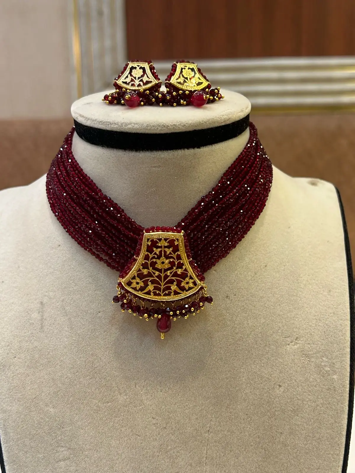 Indulge in the timeless elegance of Thewa with our exquisite "Thewa Bloom Necklace." This handcrafted masterpiece showcases the ancient art of Thewa, a unique form of jewellery making originating from Rajasthan, India. At the heart of this necklace lies a captivating design etched onto a delicate 23K gold foil. This intricate artwork, meticulously fused onto a vibrant, hand-painted glass base (specify color if known, e.g., sapphire blue or emerald green), depicts a blossoming floral motif, a symbol of beauty, prosperity, and new beginnings. Each detail, from the delicate petals to the gracefully entwined leaves, is brought to life by the skilled artisans who have passed down this cherished tradition for generations. The Thewa pendant is beautifully suspended from a complementary necklace chain. (Specify material, e.g., delicate gold-plated chain or adjustable silk cord). The necklace is designed to sit gracefully on the neckline, making it a versatile piece suitable for both traditional and contemporary attire. **Features:** * Authentic Thewa Jewellery: Handcrafted using traditional techniques. * 23K Gold Foil Detailing: Exquisite and radiant gold work. * Hand-Painted Glass Base (Specify color if known): Adds depth and vibrancy. * Floral Motif: Symbolizes beauty and prosperity. * (Specify Chain Material): Durable and stylish. * Adjustable Length (If applicable): Ensures a perfect fit. * Lightweight & Comfortable: Ideal for all-day wear. **Care Instructions:** To preserve the beauty of your Thewa Bloom Necklace, avoid contact with water, perfumes, and harsh chemicals. Store it in a soft pouch or jewellery box when not in use. **Embrace the heritage and artistry of Thewa with this exceptional necklace, a true statement piece that will be treasured for years to come.**